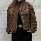 Experience timeless sophistication with the Noble Wear Women’s Vintage Suede Coat. Crafted from soft, high-quality polyester suede, this stylish outerwear combines modern streetwear appeal with classic design. The stand collar and front zipper closure create a sleek, elegant look, while button details and functional pockets add both character and practicality. Designed with a cropped, wide-waisted fit, this coat offers a flattering silhouette perfect for casual outings or evening wear during the autumn and winter seasons.