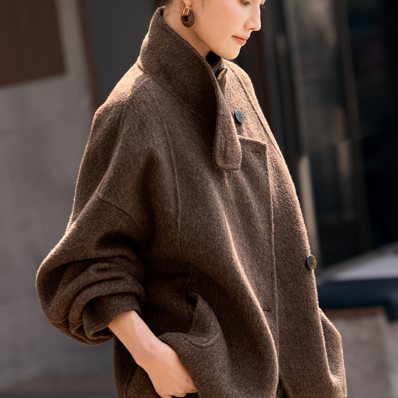 Premium wool-blend fabric (69% wool, 29.5% polyester) for warmth and comfort