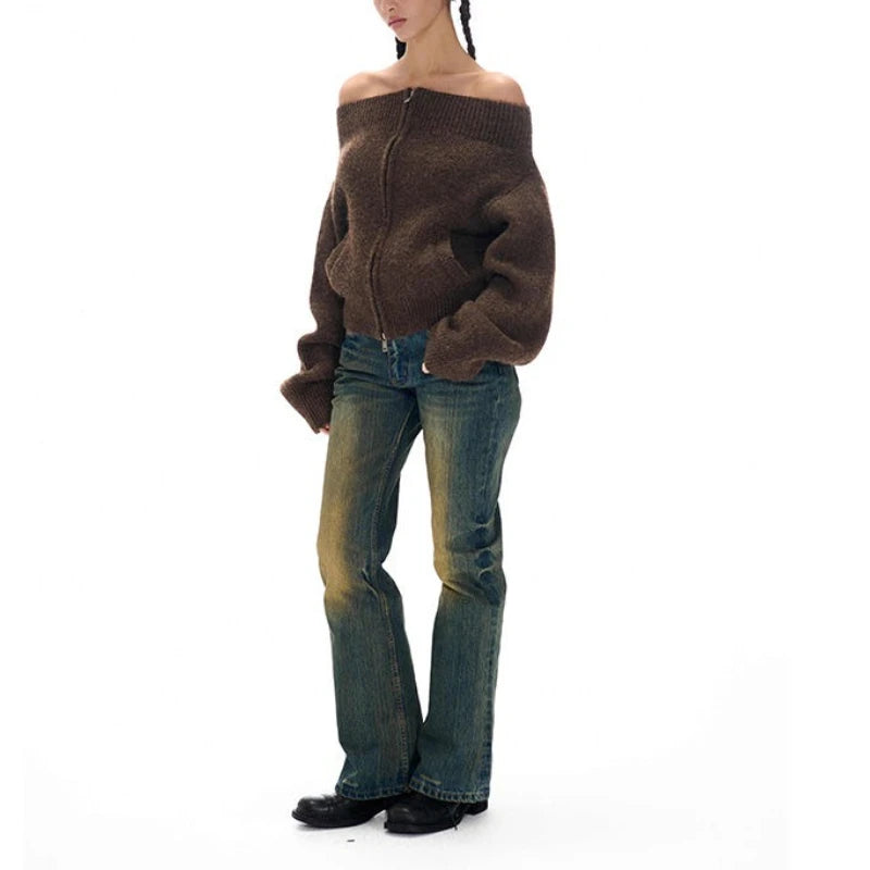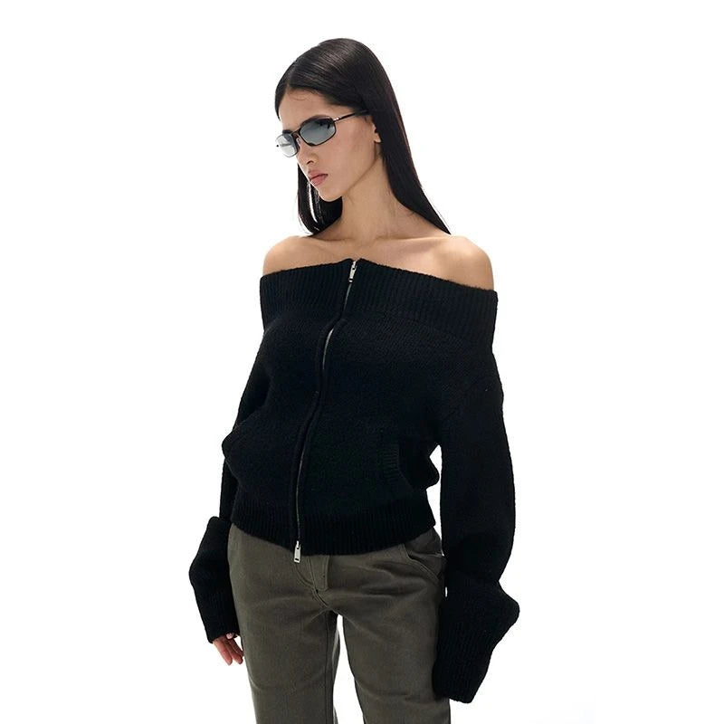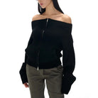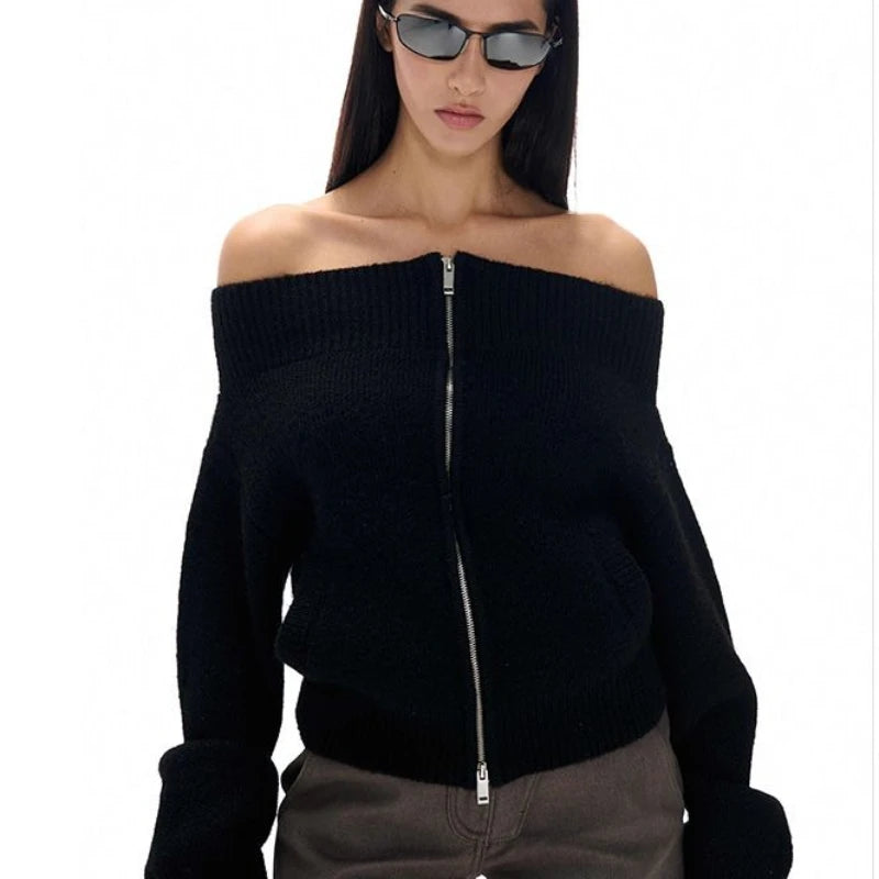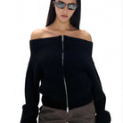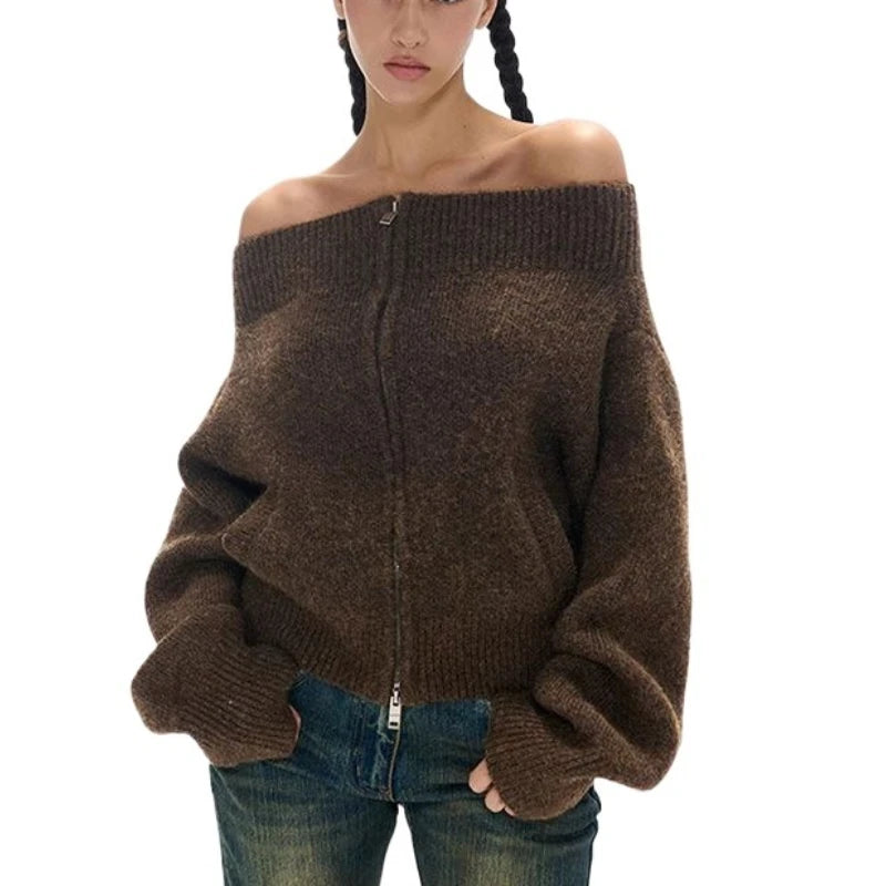Vintage Off Shoulder Zipper Top– Elegant Knitwear Cardigan for Women